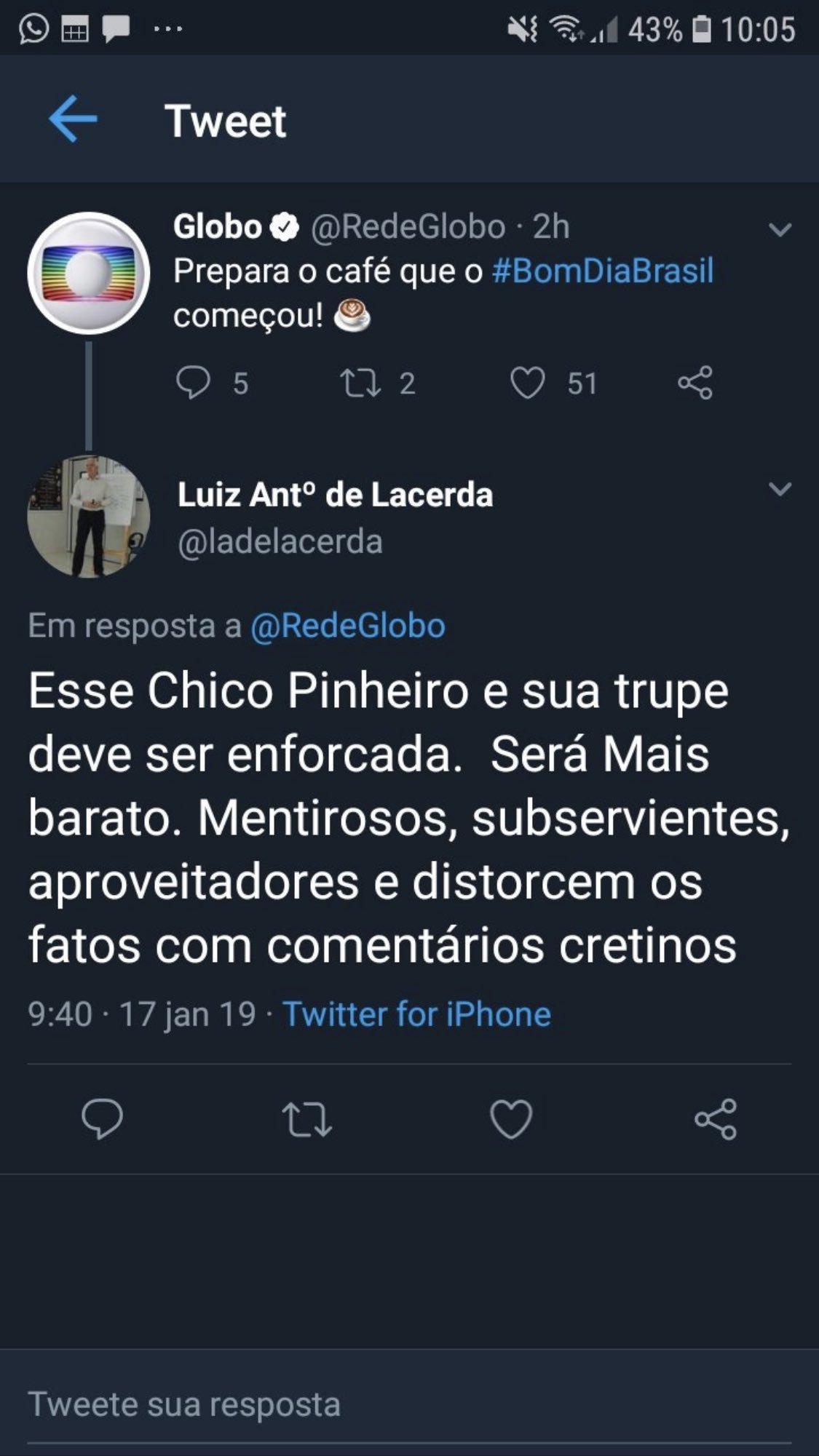 O dito "professor" aproveitou a deixa de uma postagem da Globo pra escrever "Esse Chico Pinheiro e sua trupe deve ser enforcada" (sic). Além de ter dificuldade em conviver com o "contraditório de opiniões", o cidadão tem problemas com a língua portuguesa: o correto seria escrever no plural.